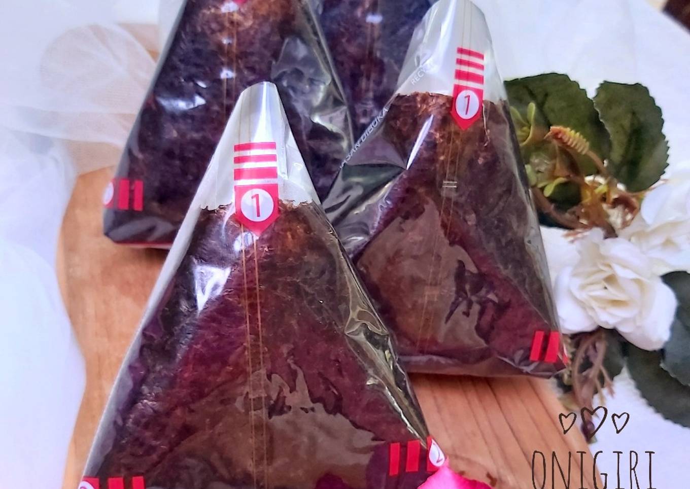 Onigiri siap dijadikan bekal. Jika akan dimakan baru plastik di buka. Dgn menarik angka 1 kebawa, sampai lepas bagian solasi belakang. Kemudian tarik perlahan satu sisi plastik.