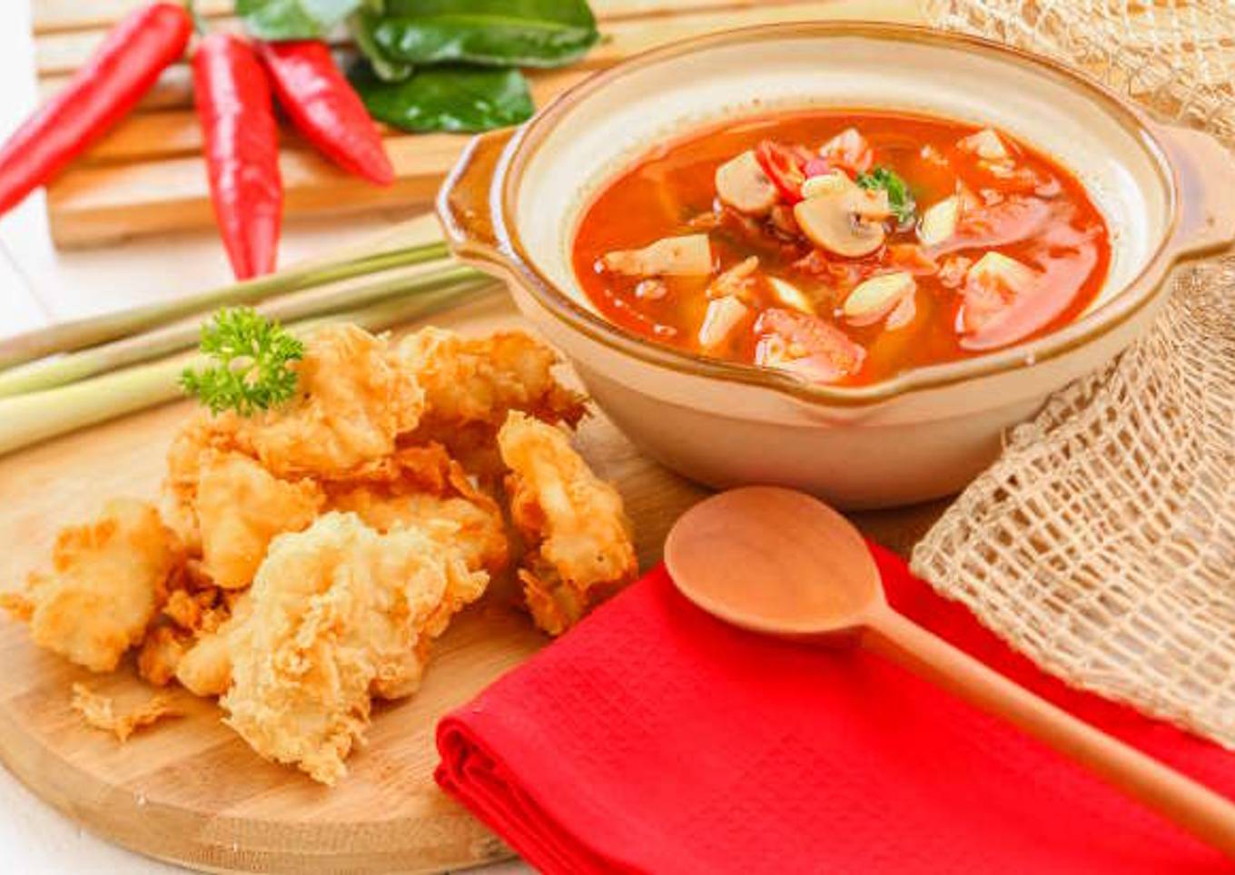 - Tata fillet ikan dori goreng di atas piring. Tuang kuah tom yum ke dalam mangkuk.